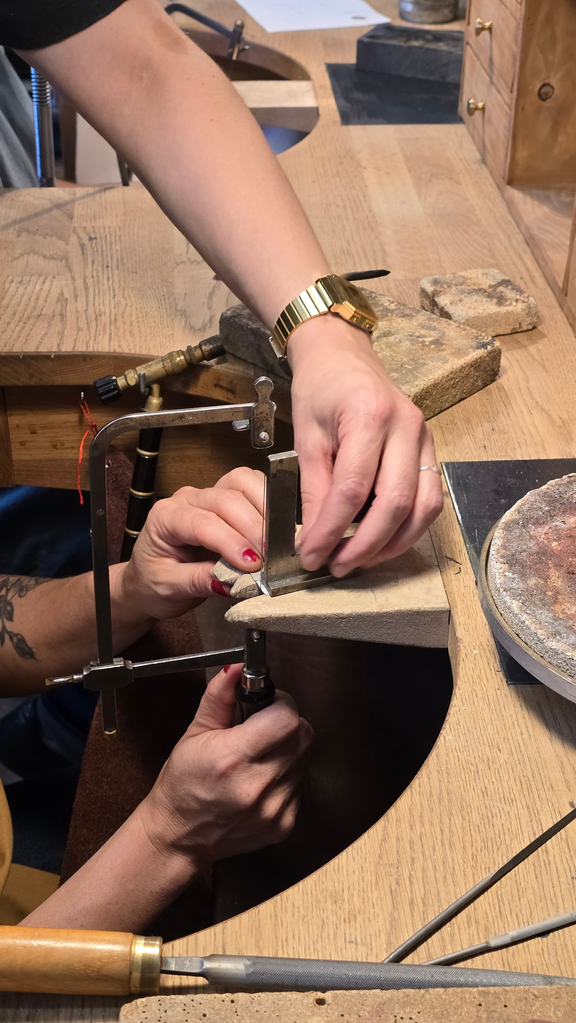 Tout au long du trimestre, vous apprendrez et pratiquerez différentes techniques de bijouterie : découpe au bocfil, fonte, martelage, travail de la cire (mise en forme dans la masse), brasure à l’argent, et diverses méthodes de texturage du métal.